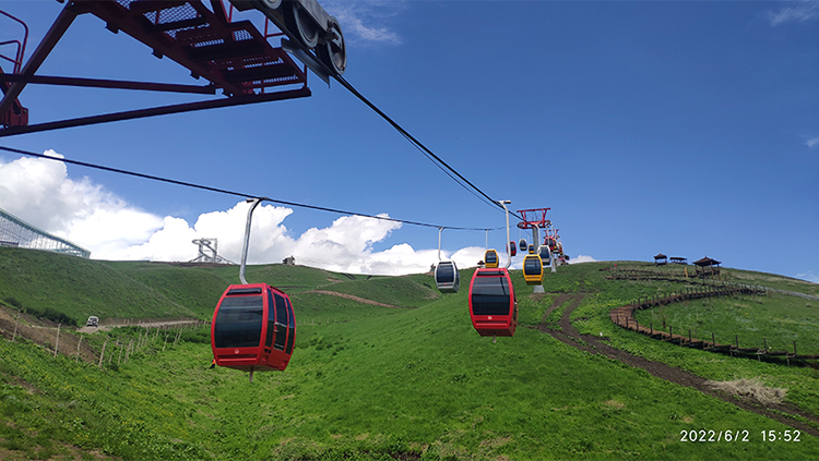 固定抱索器吊廂索道具有方便、高性價比等特點。吊箱采用封閉式,常用配置選擇2人吊箱、4人吊廂。其工作原理是一條閉合的運載索套在索道兩端的驅動輪及迂回輪上,線路中間設有支架,支架上裝有托索輪或壓索輪組,隨地形變化將運載索托起或壓下,按一定間距將吊廂用抱索器固結在運載鋼索上,動力驅動輪帶動載索,迂回輪實現線路往返來實現運送乘客的目的。2人廂和4人廂索道是景區觀光交通的性價比高的理想產品,索道的建設和維護成本相對較低。適合旅游開發投資前期。固定抱索器的2廂和4人廂索道線路速度和站內速度相對一致,線速度可站內控制變頻調速。根據廂配置,2人廂線路速度可達1米/秒,4人廂的線路速度可達0.8米/秒,乘客乘坐須站內工作人員手動開關門廂門。2人廂和4人廂的選擇,可根據不同的線路和高差來配置廂的運量和個數,以滿足客戶運營者和使用者的需求。